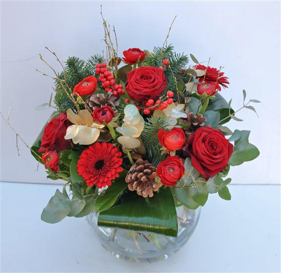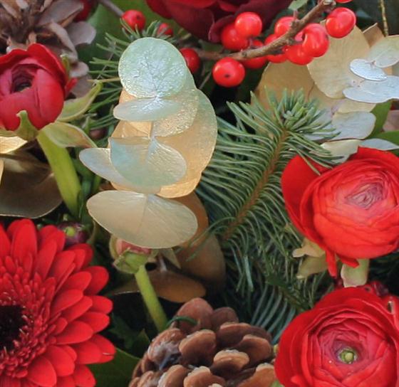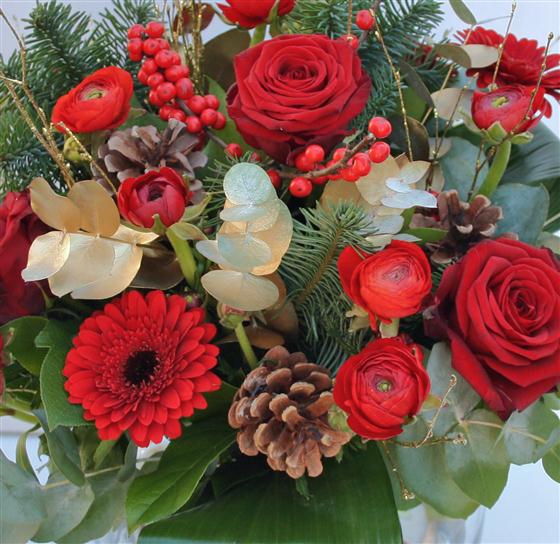 A classic, Christmas hand-tied of red roses, ranunculus, gerberas, berries, cones and gilt foliage. Spruce and eucalyptus give this a festive scent.