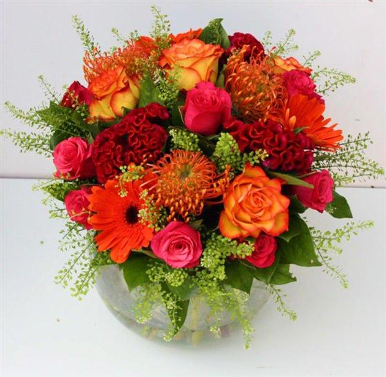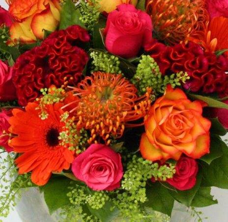 A cocktail of contrasting oranges and cerise pinks including roses, proteas and gerberas.