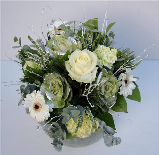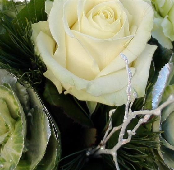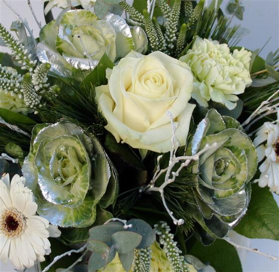 An exotic white, green and silver festive bouquet including white roses, carnations and gerberas.