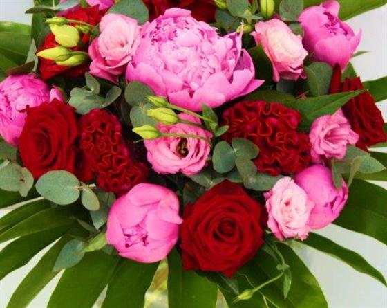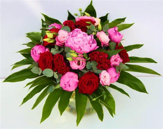 Summer peonies, lisianthus, celosia and long stemmed red roses arranged as a hand-tied bouquet.