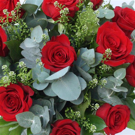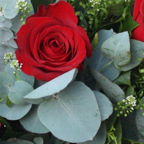 A classic hand-tied bouquet of 12 long stemmed red roses and mixed foliage including eucalyptus and salal tips.