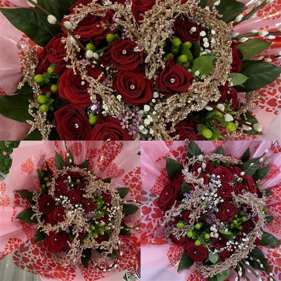 24 diamond pinned luxury red roses detailed with rose gold diamond laces also includes extra large wrapping for that WOW factor