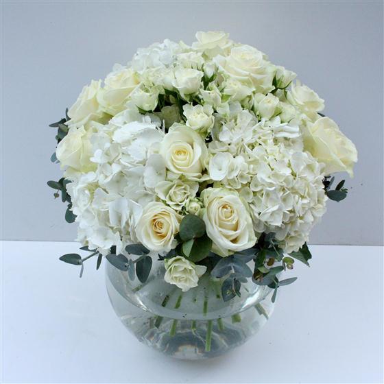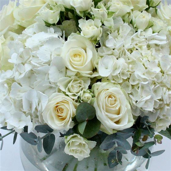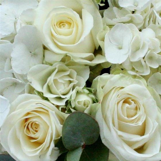A compact, crisp hand-tied bouquet of white roses, spray roses and hydrangea.